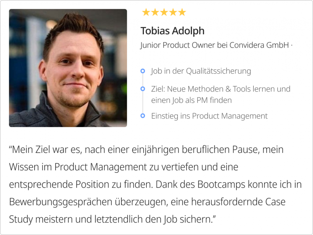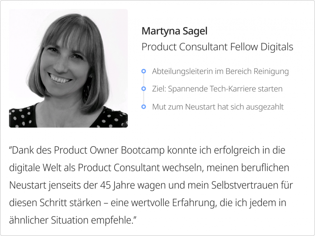 - 20 % sind bereits in Junior Product Owner/Product Manager Positionen tätig und nutzen unser Programm, um ihre Karriere auf die nächste Stufe zu heben.