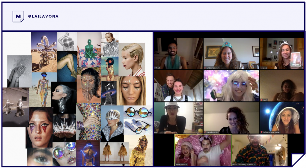 Sie wollte eine Feier kreieren, in der sich Menschen zufällig begegnen können. Zwar könnte sie dazu in Zoom Breakout-Rooms einrichten, „aber ich wollte die Leute nicht dazu drängen, in bestimmte Räume zu gehen“, so Laïla. „Sie sollten auswählen können, wo sie hingehen möchten.“