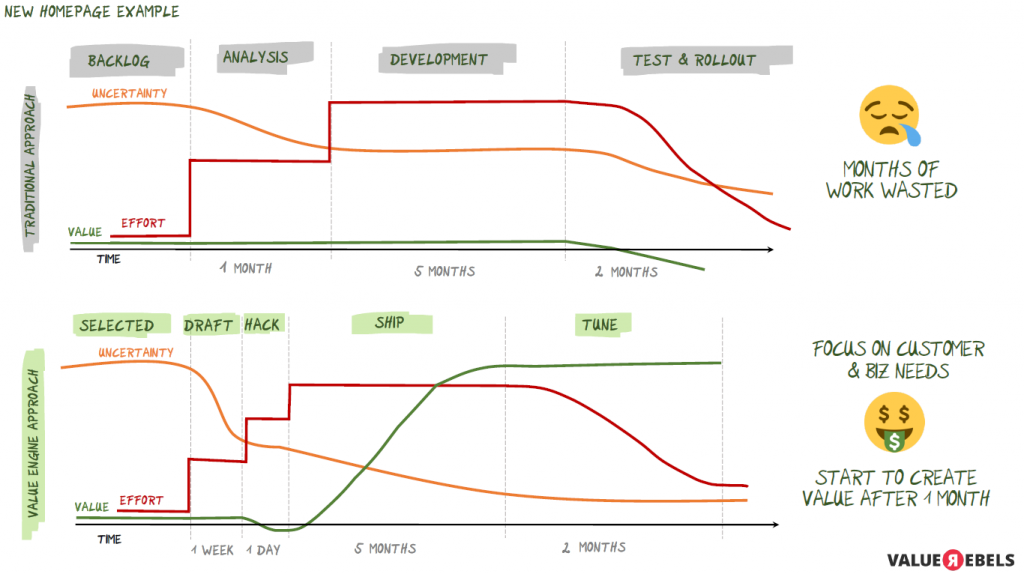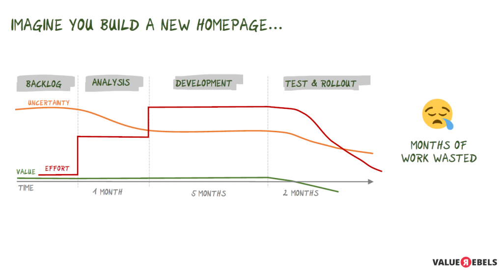 In Sprints werden dann immer mehr Funktionalitäten hinzugefügt. „Und vielleicht werden nach fünf Monaten alle Anforderungen erfüllt“, so Rainer. Und dann stellt sich in einem A-/B-Test heraus, „dass die neue Website nicht wirklich funktioniert“ – Denn alle Zahlen gehen in den Keller. „Monatelange Arbeit ist damit für den Müll“, resümiert er.