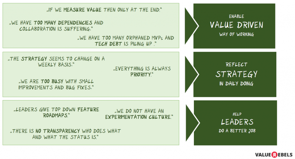 - Eine bessere Führungsarbeit sicherstellen: „Führungskräfte müssen sich mehr mit dem Kontext beschäftigen und nicht mehr mit der Feature-Roadmap“, fordert Sandra, „damit sie nicht ins Micromanagement verfallen.“