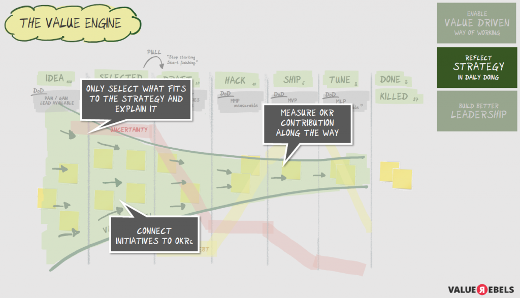 Als eine mögliche Lösung dieses Dilemmas präsentieren Sandra und Rainer ihr Konzept der „Value Engine“. Auf den ersten Blick, so Rainer, sieht es wie ein einfaches, aber unternehmensweites Kanban-Board aus, „welches alle potenziell einflussreichen, wertvollen Initiativen aufzeigt.“ Diese Umstellung sei aber ein großes Veränderungsprojekt, so Rainer. „Die Transparenz des Kanban-Boards wird diesen Kulturwandel unterstützen.“