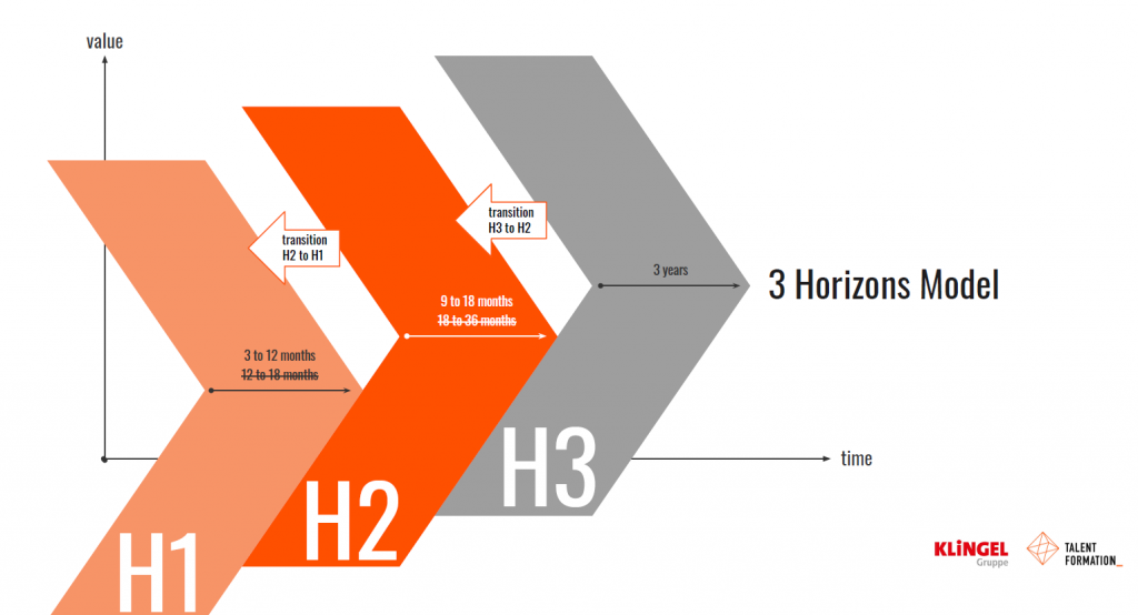 Stragetische Grundlage für den Prozess ist das „3 Horizons Model“ (siehe auch: https://www.boardofinnovation.com/blog/what-is-the-3-horizons-model-how-can-you-use-it/), welches für wachsende Unternehmen drei Horizonte des Wachstums definiert: