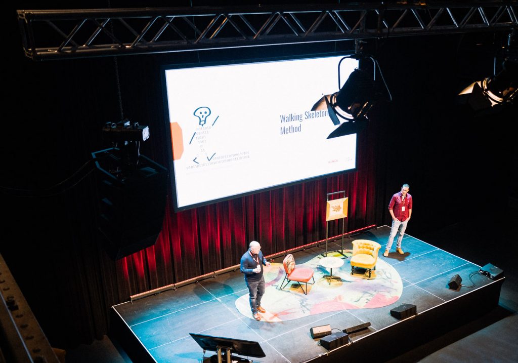 „Walking Skeleton Method“: „Walking Skeleton“ (siehe auch: https://www.techtarget.com/whatis/definition/walking-skeleton) ist ein Weg, Software in einer sehr kurzen Zeit zu entwickeln. Dabei wird mit der Implementierung der IT-Architektur bereits nach der Entwicklung einiger weniger Grundkomponenten begonnen. „Für uns war das der richtige Ansatz, weil wir am Anfang nicht wussten, wie wir die Integration erfolgreich abschließen konnten“, so Sven. Sie nutzten dazu eine eigens ausgedachte Marke, „nur um zu kontrollieren, ob wir in der Lage sind, einen Shop zum Laufen zu bringen“. Nach drei Monaten hatte das dann bereits geklappt. Der Shop hatte zu diesem Zeitpunkt noch wenige Funktionalitäten, „aber er konnte den Stakeholdern verdeutlichen, wo wir gerade stehen“. Sechs Monate später folgte dann die erste wirklich existierende Marke.